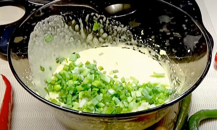 5. В отдельной миске взбейте желтки миксером. Добавьте нарезанную зелень, щепотку перца и немного соли. Хорошо перемешайте.