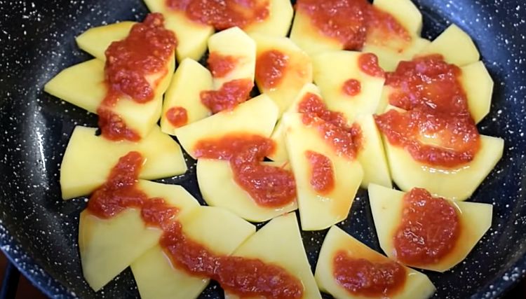 4. Очистите картофель и нарежьте его тонкими пластинками (как на чипсы или запеканку). Выложите картофель в один слой на сковороду, где жарились котлеты (масло можно чуть добавить). Сверху равномерно нанесите 3 ст. л. томатной пасты или кетчупа — он придаст соусу кисло-сладкий вкус. Поверх картофеля аккуратно выложите обжаренные котлеты. Влейте 200 мл воды (можно предварительно подсолить её немного).