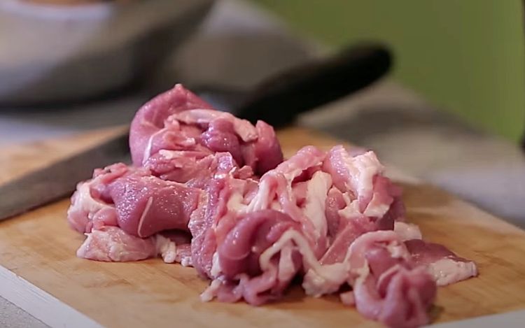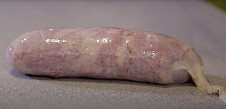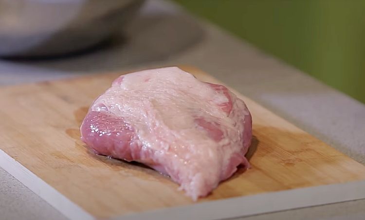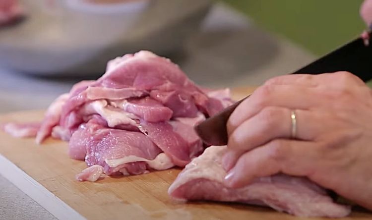 1. Хорошо промойте свинину и обсушите бумажным полотенцем. Удалите лишние пленки и сухожилия, чтобы ветчина получилась мягкой и однородной. Нарежьте мясо на полоски толщиной около 1–2 см. Постарайтесь сделать кусочки примерно одинакового размера — это обеспечит равномерное маринование и склеивание в будущем.