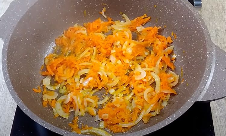 1. Разогреть сковороду на среднем огне и добавить масло. Масла должно быть достаточно, чтобы покрыть дно, но не слишком много — иначе блюдо будет жирным. Выложить нарезанный полукольцами лук, обжаривать 3–4 минуты, пока он не станет прозрачным и слегка мягким. Важно не пережарить, чтобы он не дал горечь. Добавить натертую на крупную терку морковь, перемешать с луком, жарить 2–3 минуты. Морковь станет чуть мягкой, но сохранит форму и цвет.