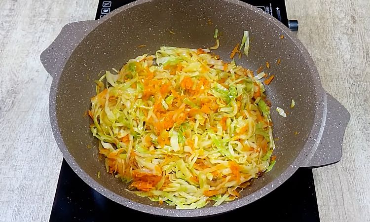 2. Добавить тонко нашинкованную капусту, хорошо перемешать, чтобы она покрылась маслом и смешалась с луком и морковью. Тушить под крышкой 5 минут, периодически помешивая. Капуста должна стать мягкой, но не потерять структуру.