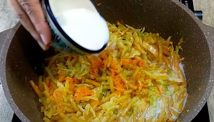 Обычно макароны варят в воде, но они не менее вкусны, если их приготовить прямо на сковороде. Соединив их с капустой, мы получим простое, но полноценное блюдо. Даже без мяса оно будет вкусным — достаточно добавить немного тертого сыра.