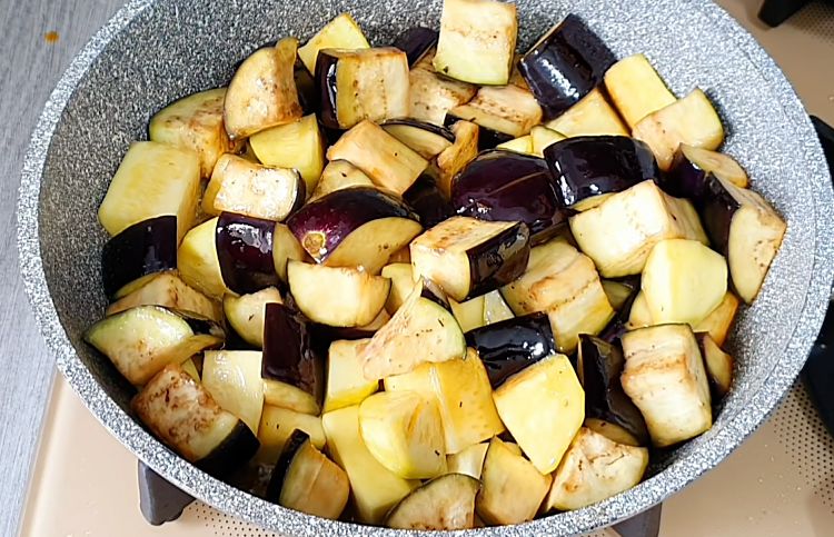 1. Перед началом приготовления баклажаны нарезаем крупными кусками и замачиваем в соленой воде на 15 минут.
