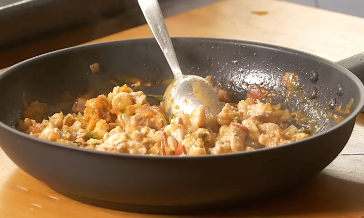 4. Кабачки уже пропеклись, дайте им немного остыть. В куриную зажарку добавьте сметану, по желанию можно также добавить специи по своему вкусу. Хорошо перемешайте начинку. Равномерно распределите приготовленную начинку в половинках кабачков.
