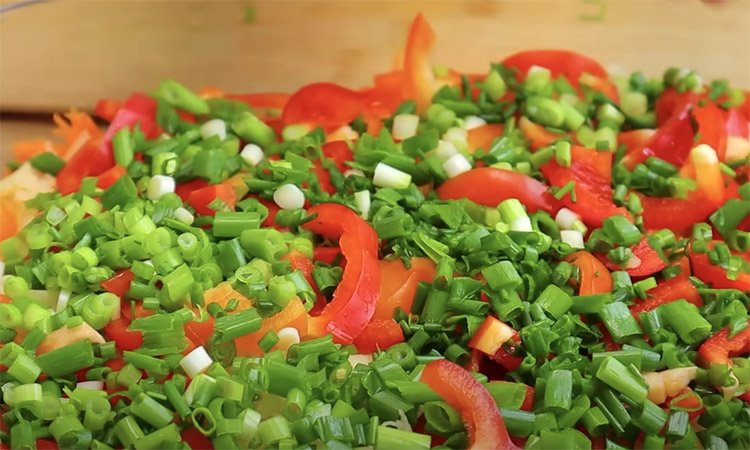 Следующим слоем натираем на морковь картофель, затем режем полосками перец и шинкуем лук. Закрываем все слоем капусты, на нее нарезаем некрупно вяленые томаты.