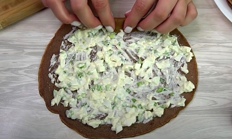 4. На каждый блин выкладываем и равномерно распределяем начинку. Сворачиваем трубочки и убираем в холодильник на 15 минут. Перед подачей нарезаем на порционные куски.