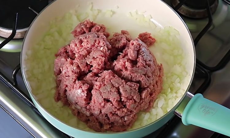 4. Взяв вторую луковицу, мелко нарежьте ее и обжарьте на сковороде вместе с фаршем. Добавьте чили и специи по вкусу.