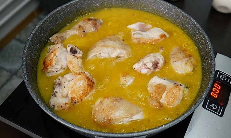 3. Примерно через 10 минут возвращаем курицу в сковороду и жарим 20-25 минут, доводя ее до готовности прямо в соусе. Можно накрыть крышкой для сохранения влаги или оставить открытой, если вам нравится более густые и вязкие соуса.