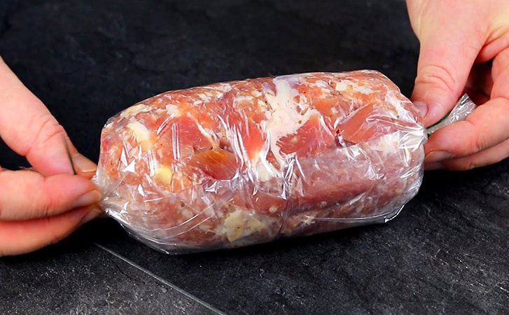 Мясо режем длинными полосками. Натираем на него чеснок. Посыпаем мясо приправой и солим. Перемешиваем и отправляем в холодильник на 12 часов. Треть мяса пропускаем через мясорубку, получившийся фарш смешиваем с нашим мясом и отбиваем в пакете. Массу делим на 2 части. Заворачиваем в рукав для запекания и сверху — пищевой пленкой.