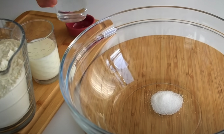В глубокую миску сначала пересыпаем соль. Вливаем молоко и воду, перемешиваем до полного растворения соли. Вводим сразу всю муку и быстро замешиваем плотное, в меру эластичное тесто. Оставляем его под пленкой примерно на полчаса, пусть немного поднимется.