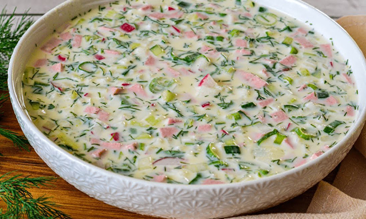 Приготовленная на кефире окрошка имеет лишь один недостаток: ярко выраженный кисло-молочный вкус. Мы решим эту проблему очень просто, добавив к смеси совсем немного минералки.
