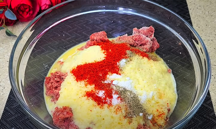 Затем погружным блендером измельчите все в однородную массу. Вылейте ее к фаршу, добавьте специи и соль и снова тщательно все перемешайте. Из получившейся массы сформируйте небольшие, плотные котлеты.