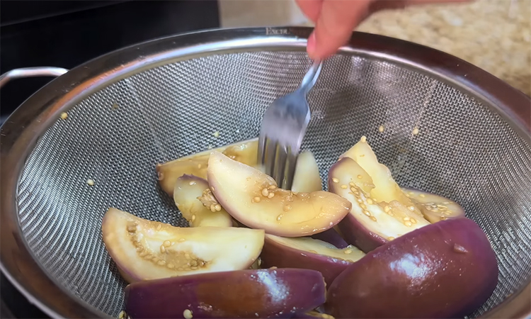 Баклажаны режем ломтиками, присыпаем солью и оставляем пока в стороне, пусть дадут сок. Через 5 минут чуть придавите баклажаны, слейте воду и приготовьте их на пару: проще всего будет вскипятить воду в кастрюле, баклажаны пересыпать в дуршлаг и поставить над кипятком, накрыв саму кастрюлю крышкой. 10 минут такой термообработки им вполне хватит.