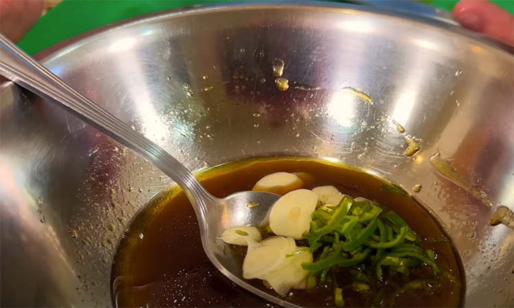 Теперь подготовим особую заправку. В отдельную миску вливаем масло, яблочный уксус, соевый соус и мед. Он здесь не даст сладости, зато значительно усилит вкус. К заправке пропустите через пресс чеснок, нарежьте мелкими кусочками острый перец, все тщательно перемешайте.