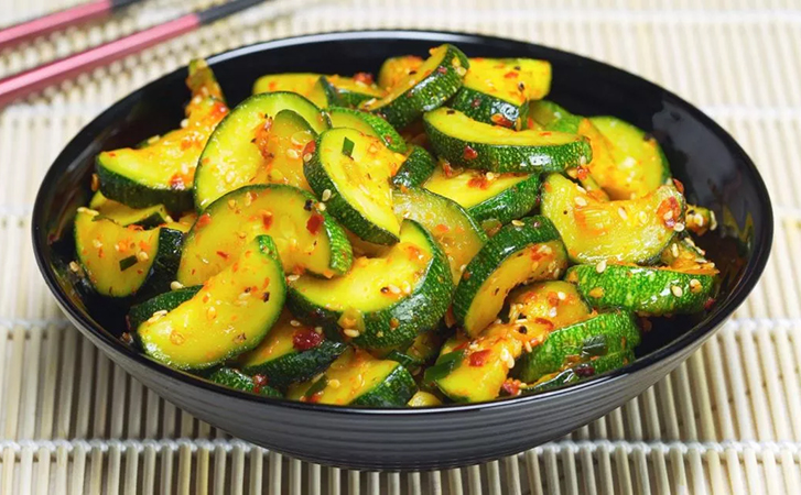 Разогреваем в сковороде растительное масло и обжариваем кабачки с зеленым луком, чесноком, кунжутным маслом, солью, перцем и сахаром. Можно добавить перец чили и немного рыбного или соевого соуса.