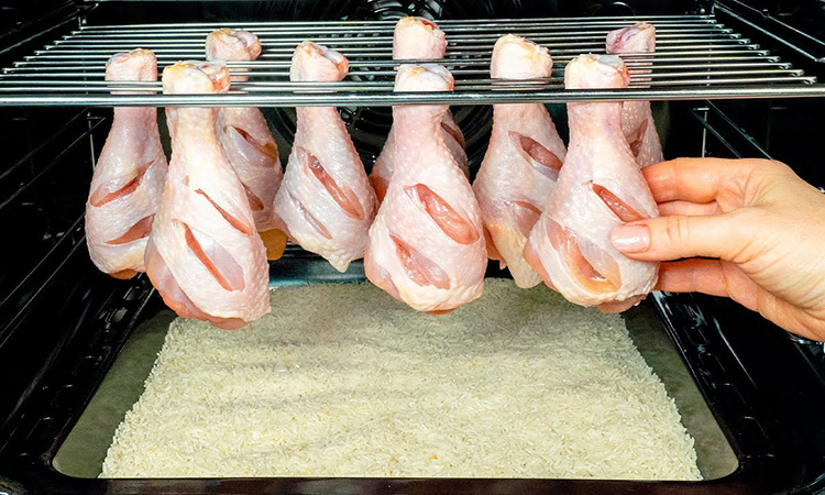 Выливаем смесь к курице, снова перемешиваем и оставляем мариноваться на 30 минут. Рис варить не нужно, просто промываем его и выкладываем в один слой на противень. Сверху распределяем зеленый горошек, вливаем бульон и сливки. Ставим противень в нижнюю часть духовки, а на решетку подвешиваем курицу, как показано на фото: