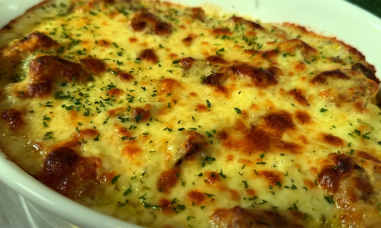 Готовую тыкву перекладываем в форму для запекания, заливаем сырным соусом, добавляем оставшийся сыр и запекаем под фольгой в духовке при 220°С в течение 15 минут. Затем снимаем фольгу и допекаем ещё 5-7 минут до румяной корочки.