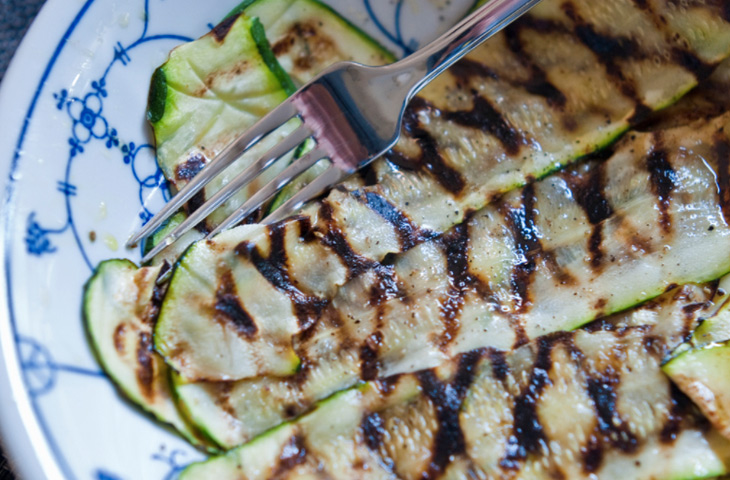 Цукини разрезают вдоль на две половинки, чтобы лучше прожарились и не потеряли форму. Приправляют их солью и порошком обжаренного карри — специя добавляет необычный пряный оттенок и слегка пикантный вкус. Обжаривают цукини на гриле в зоне сильного жара примерно 10-15 минут, пока они не станут мягкими и с красивыми золотистыми полосками от решётки. Перед подачей половинки цукини сбрызгивают свежим лимонным соком и оливковым маслом, а затем добавляют ещё немного соли — это освежает вкус и подчёркивает аромат.