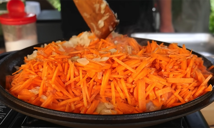 Подготовьте перцы: срежьте плодоножку с крышечкой и удалите сердцевину с семенами. Хвостики и крышечки не выбрасывайте, их можно заморозить и использовать для бульонов или соусов. Морковь нарежьте тонкой соломкой, лук – мелким кубиком. Разогрейте масло и пассируйте сначала лук до мягкости, затем добавьте морковь и доведите до золотистого цвета.