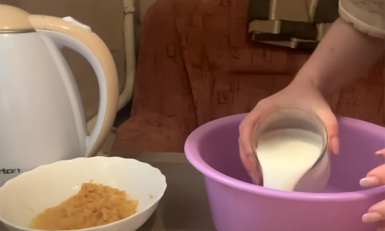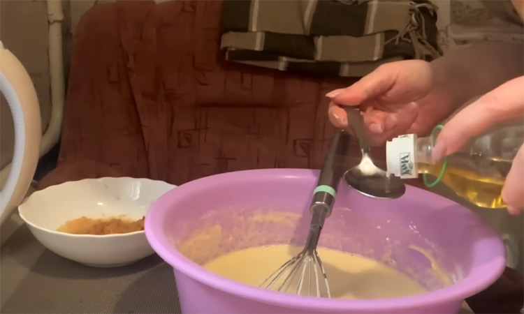 Очистите яблоко от кожуры и натрите на средней тёрке. Оставьте его на несколько минут, чтобы пустил сок, затем слегка отожмите мякоть. В миске соедините молоко и яйца, добавьте щепоть соли, сахар и ванильный сахар.