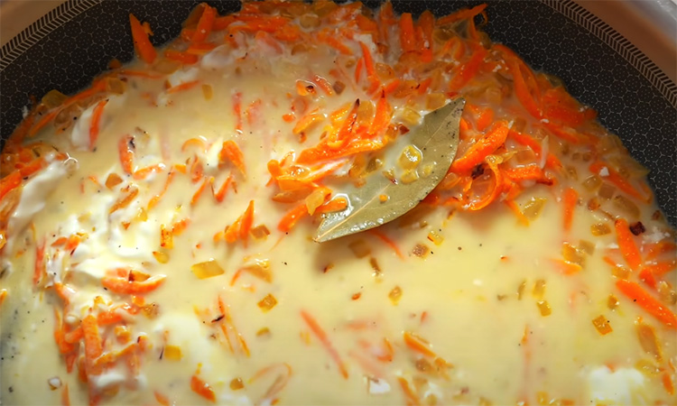 В сковороде растопите сливочное масло, обжарьте лук до золотистости, добавьте морковь и жарьте ещё 3–4 минуты. Введите чеснок, перемешайте. Влейте воду, добавьте сметану, лавровый лист, посолите и поперчите, дайте закипеть и поварите 2 минуты. Посыпьте стол мукой и раскатайте тесто в тонкий квадрат или прямоугольник (около 60×60 см).