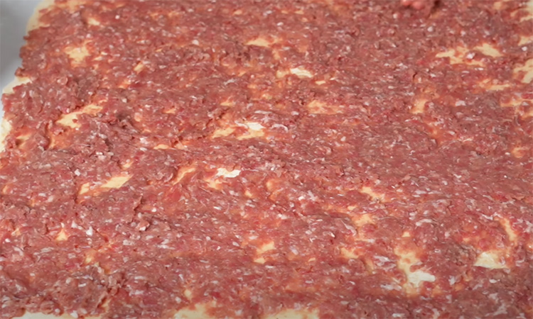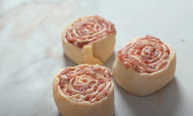 Равномерно распределите фарш по поверхности и сверните пласт рулетом. Край без начинки слегка смажьте водой для склейки. Разделите рулет на две части. Одну часть можно заморозить, вторую нарежьте на порционные кусочки-пельмени.