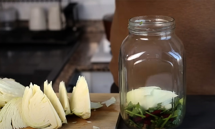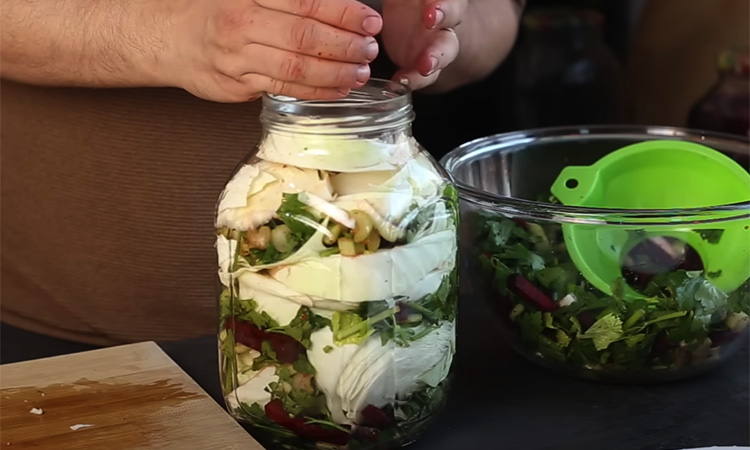 В чистые банки начинайте укладывать слоями: зелень и свеклу, 2–3 зубчика чеснока, затем слой капусты. Утрамбуйте, снова добавьте зелень, свеклу и чеснок, и так до верха. Последний слой сделайте из крупных кусков капусты – они будут удерживать остальные от всплывания и заменят груз. Процедите горячий рассол и залейте капусту так, чтобы он полностью покрыл овощи.