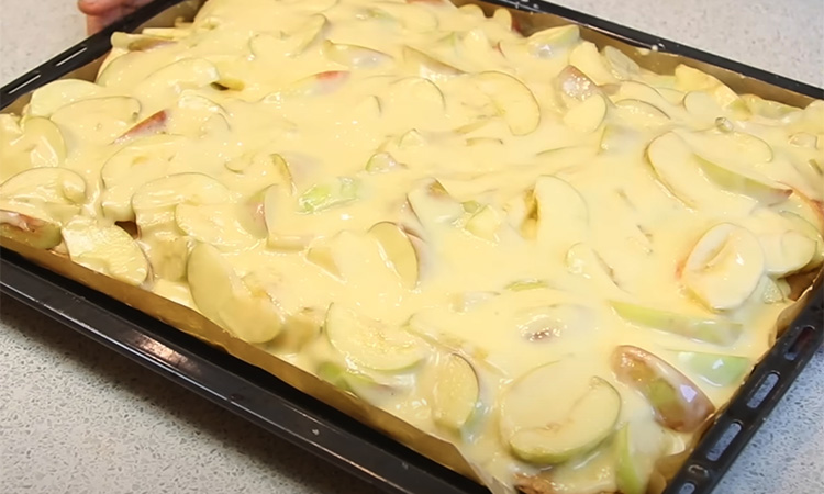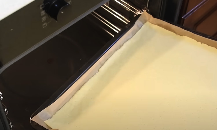 Сверху залейте жидким тестом, распределив его равномерно. Выпекайте при 180 °C в течение 35–40 минут до румяности. Готовность проверьте деревянной шпажкой — она должна выходить сухой.