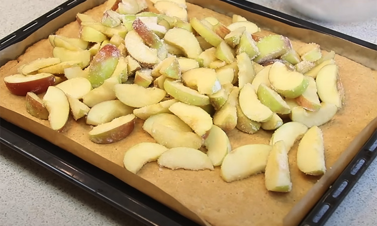 Противень размером около 30×40 см застелите пергаментом. Раскатайте тесто, выложите в форму и наколите вилкой. Выпекайте при 180 °C 15 минут до лёгкой золотистой корочки. Для начинки очистите яблоки и нарежьте их дольками.