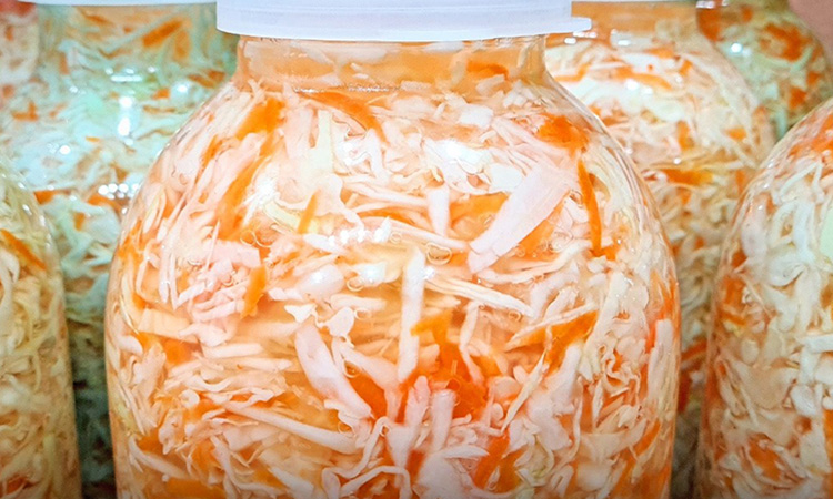 Протыкивать не нужно, процесс идёт спокойно, без пены, и капуста получается более плотной. После этого уберите банки в холодное место для хранения. Такая капуста сохранится до следующего урожая. — Быстрый способ: оставьте при +18…+22 °C на 2–3 дня. Дважды в день протыкайте капусту деревянной палочкой, чтобы выпустить газы. После этого уберите в холод, чтобы остановить брожение, иначе капуста перекиснет.