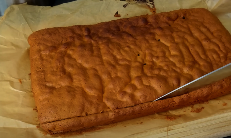 Тесто получится достаточно жидким, похожим на густой бисквит. Подготовьте форму — прямоугольную или круглую, застеленную бумагой для выпечки. Вылейте тесто, разровняйте поверхность и выпекайте при температуре 180 градусов около 15 минут. Готовность проверяйте деревянной шпажкой: если она выходит сухой, бисквит готов. Оставьте корж немного остыть, затем аккуратно обрежьте края, чтобы выровнять форму. Обрезки не выбрасывайте — они понадобятся для обсыпки.
