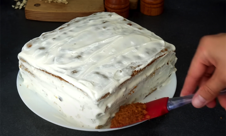 Разрежьте пласт на две части, а затем каждую — ещё пополам. У вас получится четыре ровных коржа. Теперь приготовьте крем. В глубокой миске соедините сметану и творожный сыр. Перемешайте венчиком до однородной консистенции. Добавьте сахарную пудру и аккуратно перемешайте — не используйте миксер, чтобы крем не стал жидким. Приступайте к сборке торта. Выложите первый корж, смажьте кремом, по желанию добавьте измельчённые грецкие орехи или кусочки чернослива.