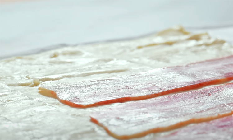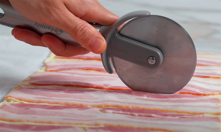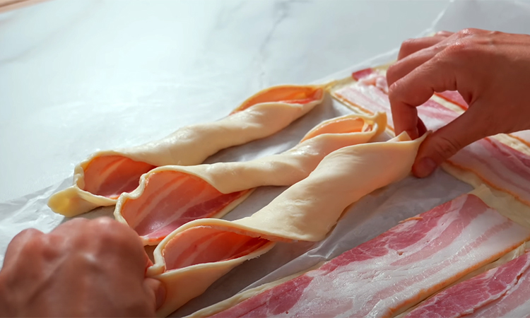 Разморозьте слоеное тесто при комнатной температуре, чтобы оно стало мягким и эластичным. Раскатайте его в прямоугольный пласт толщиной примерно 3 миллиметра. Постарайтесь не пересыпать поверхность мукой, чтобы тесто сохранило легкость и хорошо поднималось при выпекании. Возьмите тонко нарезанный бекон.