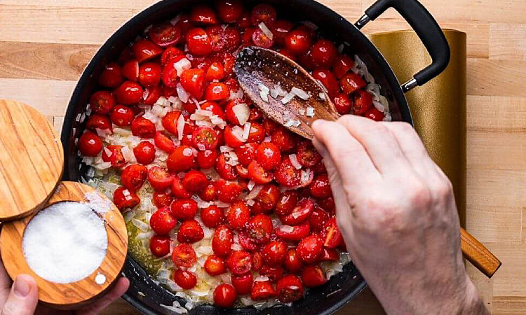 3. Добавьте половинки черри к луку. Слегка перемешайте. Посолите, поперчите по вкусу. Уменьшите огонь до ниже среднего, чтобы соус томился, а не жарился. Тушите помидоры около 30 минут, периодически помешивая. В процессе помидоры дадут сок, а масло превратится в насыщенный томатно-сливочный соус.