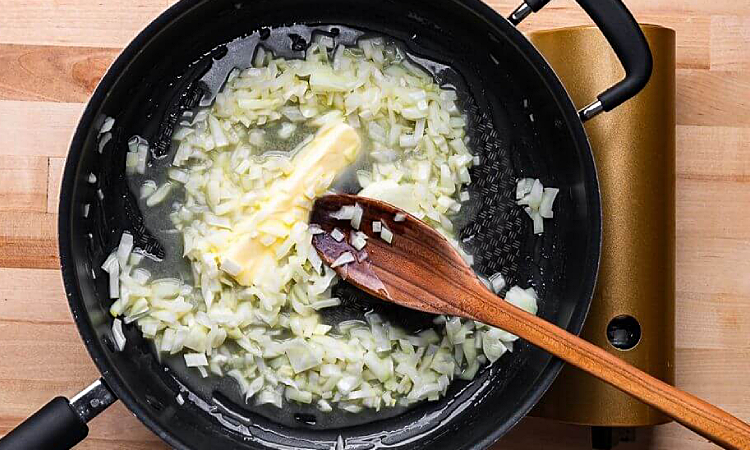 2. Поставьте большую сковороду с высокими бортиками на средний огонь и растопите сливочное масло. Важно, чтобы масло не подгорало — оно должно стать прозрачным и слегка пениться. Добавьте нарезанный лук. Обжаривайте 3–5 минут, пока он не станет мягким и прозрачным, постоянно помешивая. Лук не должен зажариться до золотистой корочки.