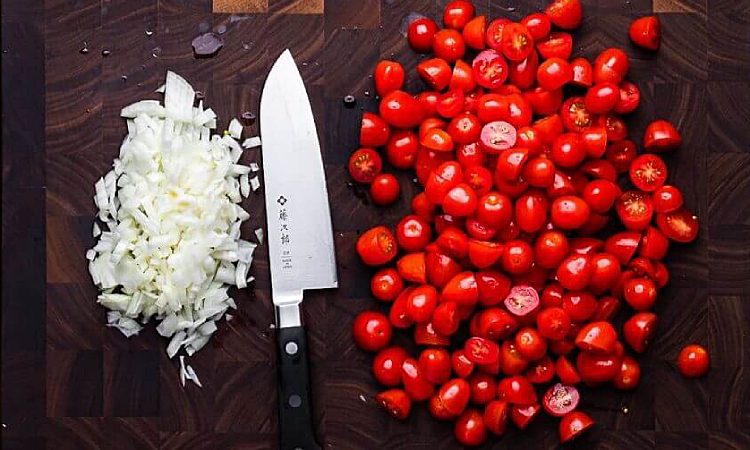1. Очистите и мелко нарежьте лук, стараясь, чтобы кусочки были одинакового размера для равномерного приготовления. Помидоры черри промойте, обсушите и разрежьте пополам; крупные плоды можно разделить на 3–4 части. Базилик и петрушку тщательно промойте, обсушите бумажным полотенцем и мелко нарубите.