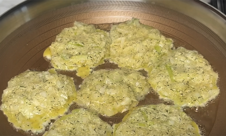 Ложкой выкладывайте тесто, формируя оладьи. Обжаривайте их с двух сторон до золотистого цвета, потом переложите на бумажное полотенце, чтобы убрать лишний жир. В стакане смешайте йогурт с перетёртыми томатами, добавьте немного соли и воды.
