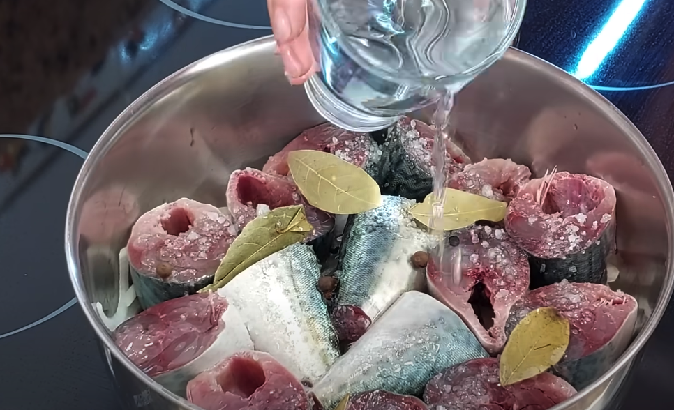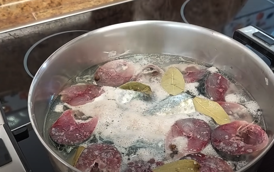 Убавьте нагрев до минимума, накройте крышкой (можно чуть приоткрыть) и оставьте томиться на слабом огне 3 часа. Не перемешивайте во время варки — рыба должна сохранять форму. После окончания варки выключите нагрев и дайте рыбе полностью остыть прямо в кастрюле. Так она останется цельной и сочной.
