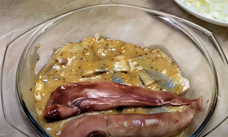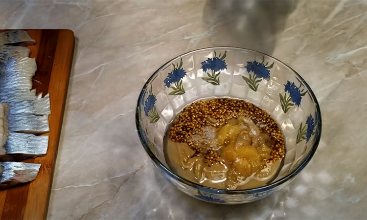 Если в рыбе есть молоки или икра — оставьте их, они тоже отлично промаринуются. Для маринада смешайте в глубокой миске обе горчицы, мед, соль, лимонный сок и растительное масло. Перемешайте венчиком до однородности, чтобы мед полностью растворился. Масса должна получиться густой, маслянистой и ароматной. Возьмите стеклянную форму или банку. На дно выложите треть лука, распределите ровным слоем.