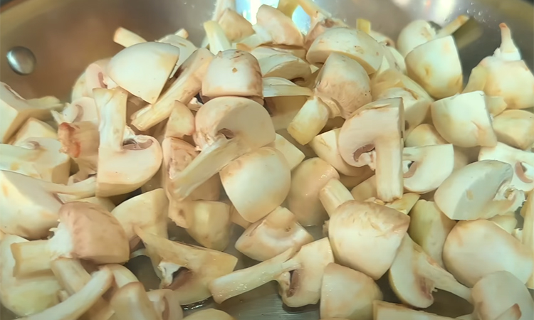 Шампиньоны промойте и аккуратно вытрите бумажным полотенцем. Не держите их долго в воде — грибы впитывают влагу. Крупные шампиньоны разрежьте на четыре части, средние — пополам. Кожицу не снимайте, если грибы не слишком крупные. Разогрейте сухую сковороду с толстым дном до очень высокой температуры — капля воды должна собираться в шарик и не испаряться мгновенно. Добавьте немного растительного масла и выложите грибы одним слоем.