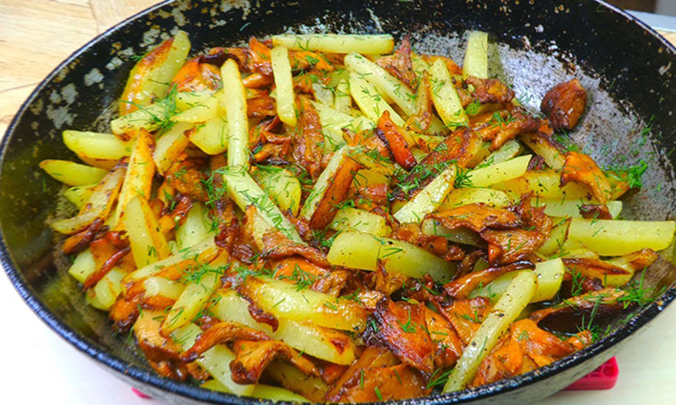 По-настоящему вкусной жареную картошку делает румяная корочка, внутри же ломтики должны остаться нежными, словно пюре. Добиться этого просто: после бланшировки картофель обжаривается быстрее обычного и не прилипает к сковороде. Добавим грибы и получим уже полноценный ужин.