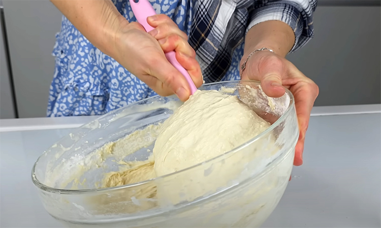 В тёплой смеси молока и воды растворите сахар и дрожжи, добавьте немного муки, чтобы получилась густая опара. Оставьте на 10–15 минут. Затем введите соль, оставшуюся муку и начинайте замес. Постепенно добавляйте растительное масло, вымешивая 7–10 минут. Тесто будет липким — не поддавайтесь соблазну добавить муку. Именно это сделает пироги нежными.