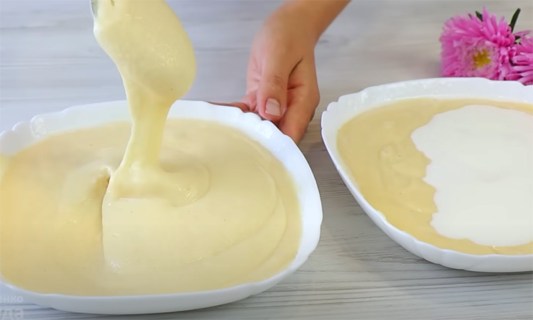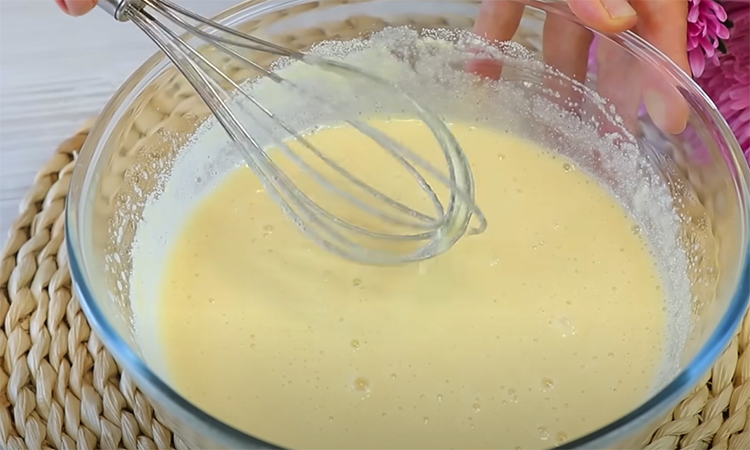 Разбейте яйца в миску, добавьте сахар, ванильный сахар и щепотку соли. Перемешайте венчиком до однородности. Влейте кефир комнатной температуры и добавьте половину чайной ложки соды. Перемешайте, затем влейте растительное масло без запаха. Постепенно просейте муку и вмешайте до гладкой консистенции — тесто должно получиться текучим, но не жидким.