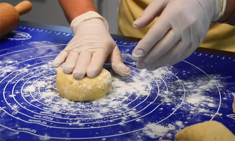 Теперь начинайте вводить муку: сначала половину нормы, затем постепенно добавляйте остальное, пока не получите мягкое, эластичное тесто, не липнущее к рукам. Его консистенция должна напоминать мягкое картофельное пюре, из которого можно лепить. Разделите тесто на две части, каждую — ещё на три, чтобы получилось шесть лепешек. Стол слегка присыпьте мукой, раскатайте каждую лепешку достаточно тонко, примерно 3–4 мм.