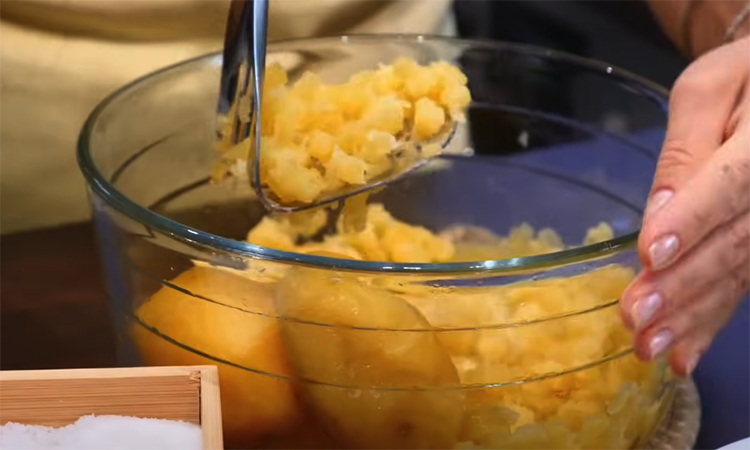 Картофель отварите в мундире до мягкости, остудите и очистите. Разомните его в миске до состояния пюре, без крупных комков. Если картошка горячая, дайте ей полностью остыть — иначе тесто впитает слишком много муки и получится жестким. Добавьте соль и немного молотого черного перца, перемешайте. Всыпьте натертый сыр (лучше, чтобы он был мягким и тянущимся, например моцарелла).