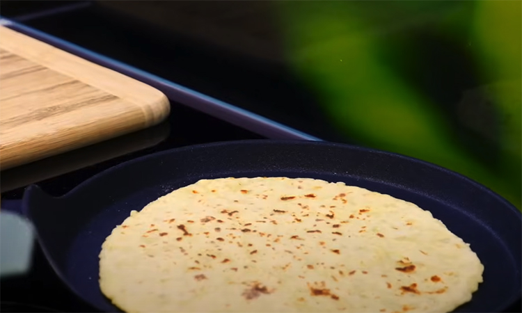 Разогрейте сухую сковороду и обжаривайте лепешки без масла по 2–3 минуты с каждой стороны, пока не появится ровная золотистая корочка. Когда лепешка подрумянится, аккуратно переверните её лопаткой. Готовые складывайте стопкой и сразу смазывайте сливочным маслом, пока они горячие — от этого появляется мягкость и характерный сливочный аромат.