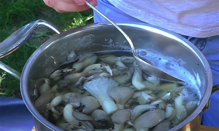 Вешенки очистите, отделите от корешков, крупные шляпки разрежьте пополам. Вскипятите воду и опустите грибы. Варите 15 минут после закипания, снимая пену, чтобы отвар остался чистым. Готовые вешенки переложите в миску, а поллитра грибного отвара сохраните — на нём будет готовиться рассол. В отвар добавьте соль, сахар, лавровый лист, кориандр, горчицу, гвоздику, душистый и чёрный перец.