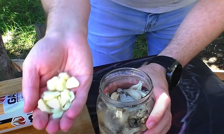 Прокипятите 4 минуты, чтобы специи раскрылись и рассол стал насыщенным. Грибы выложите в литровую банку или стеклянный контейнер, добавьте нарезанный чеснок. Через сито влейте горячий рассол, чтобы специи не попали внутрь. Накройте крышкой и слегка встряхните. Оставьте на столе до полного остывания, затем уберите в холодильник на сутки.