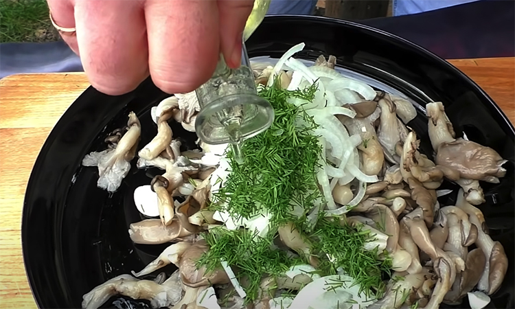 Через 24 часа грибы готовы. Слейте рассол, добавьте нарезанный тонкими полукольцами лук, немного укропа и подсолнечное масло. Аккуратно перемешайте и подавайте на стол.