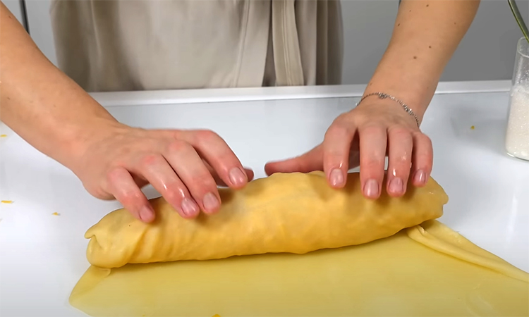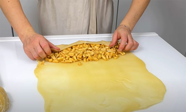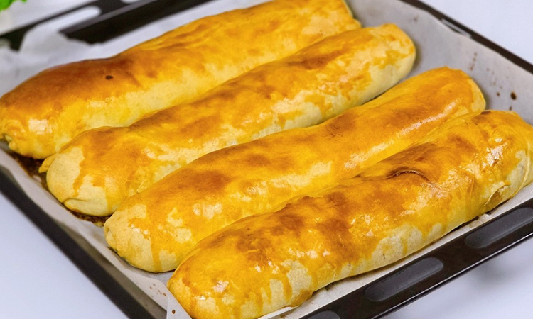 Равномерно выложите начинку, оставив по краям немного места, сверните в рулет, подогните края, чтобы сок не вытекал. Выложите вертуты на противень, застеленный бумагой для выпечки. При желании смажьте смесью яйца и молока. Выпекайте при 190 градусах около сорока пяти минут до равномерной золотистой корочки.